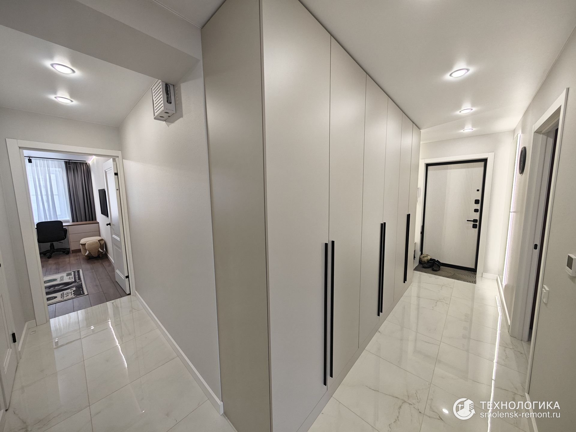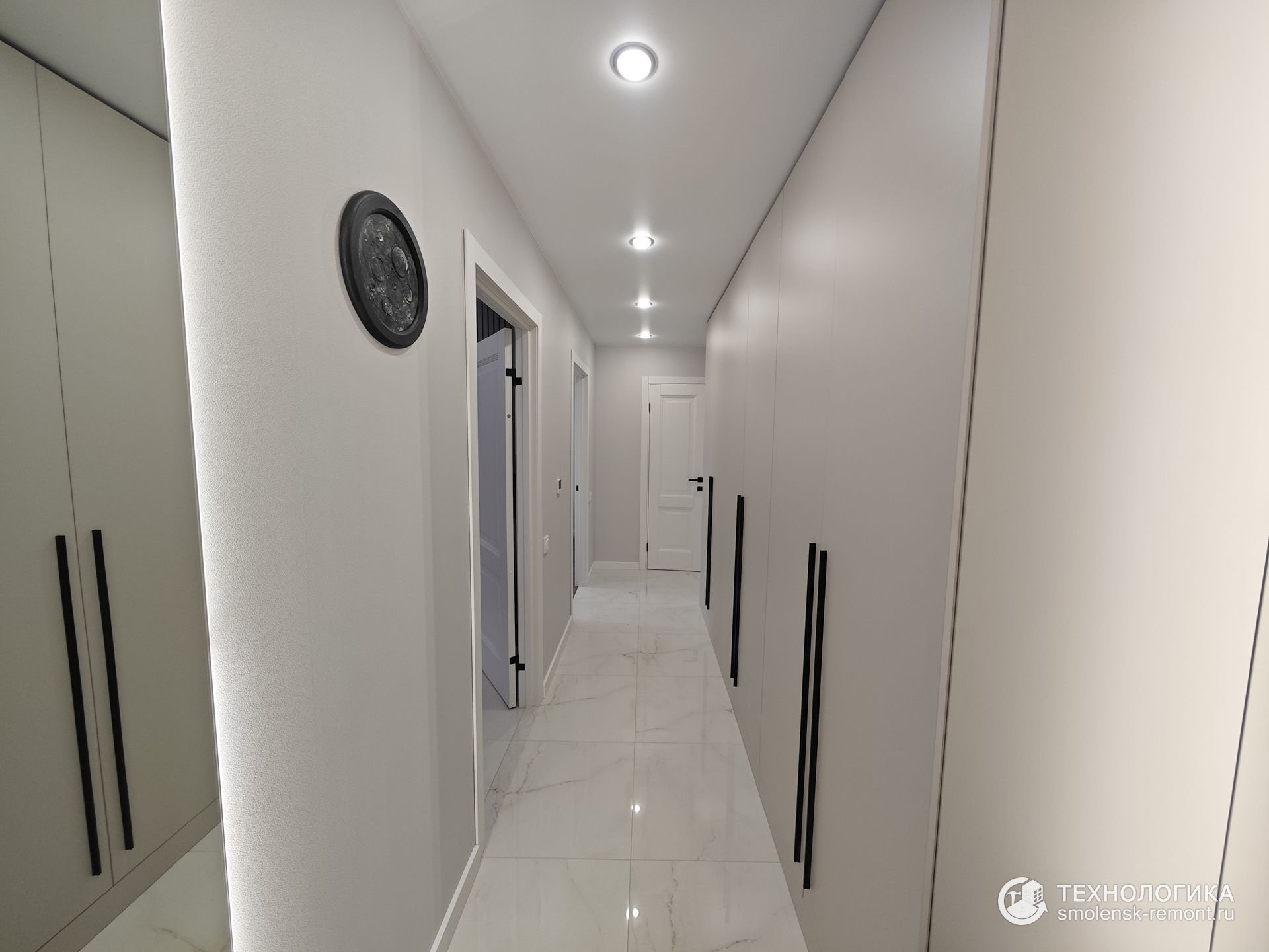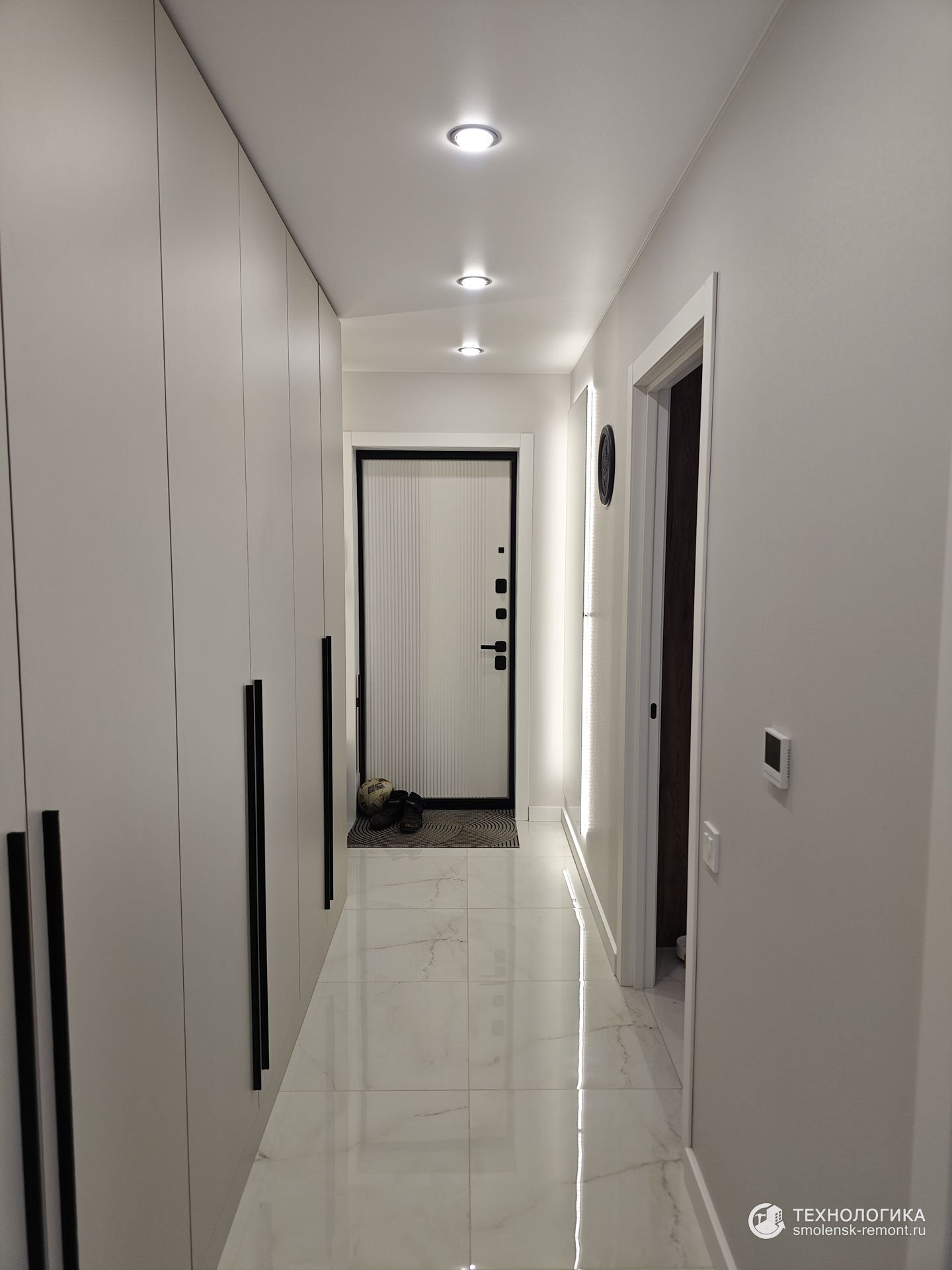 Коридор встречает светлым керамогранитом с лёгким мраморным рисунком — практичное и износостойкое покрытие, которое не боится грязи и влаги. Встроенные шкафы во всю стену скрывают систему хранения, сохраняя геометрию пространства и чистоту линий. Белые фасады с чёрными ручками подчеркивают минимализм интерьера, а точечное освещение визуально делает помещение просторнее.