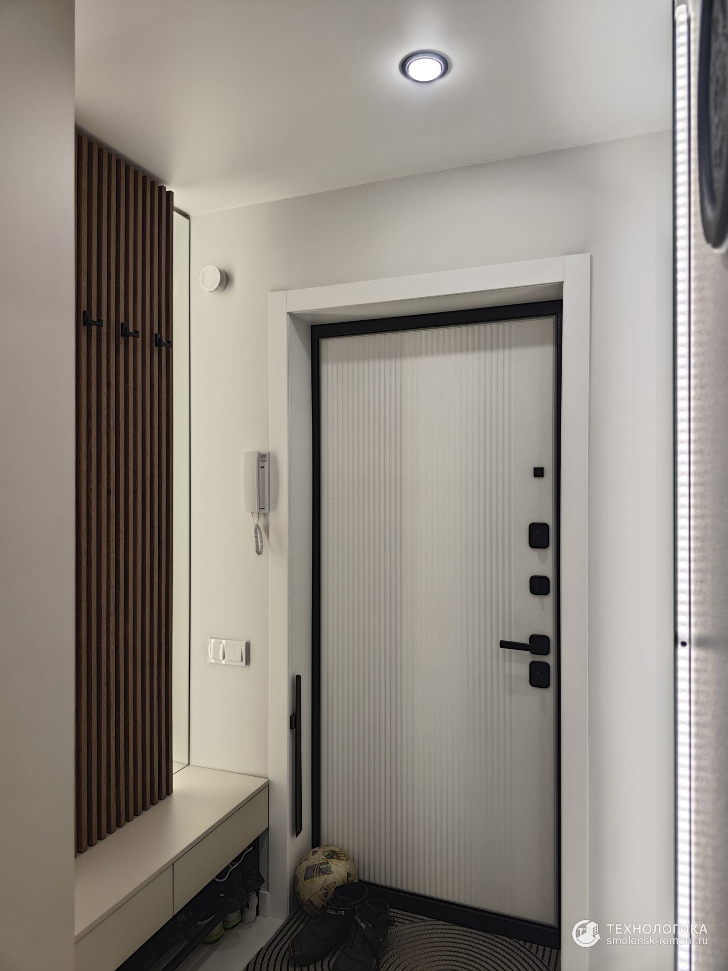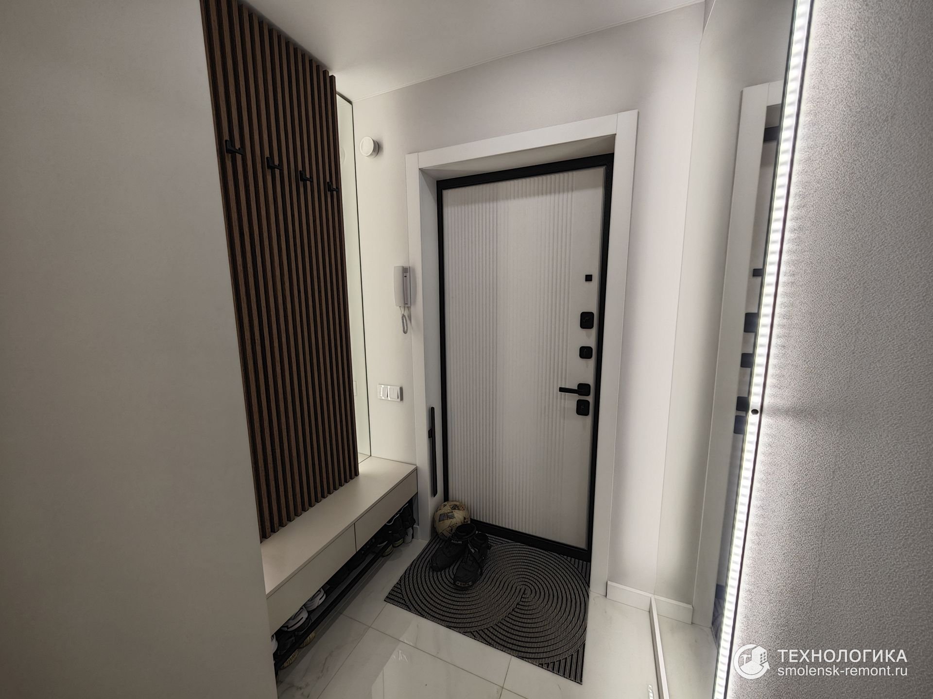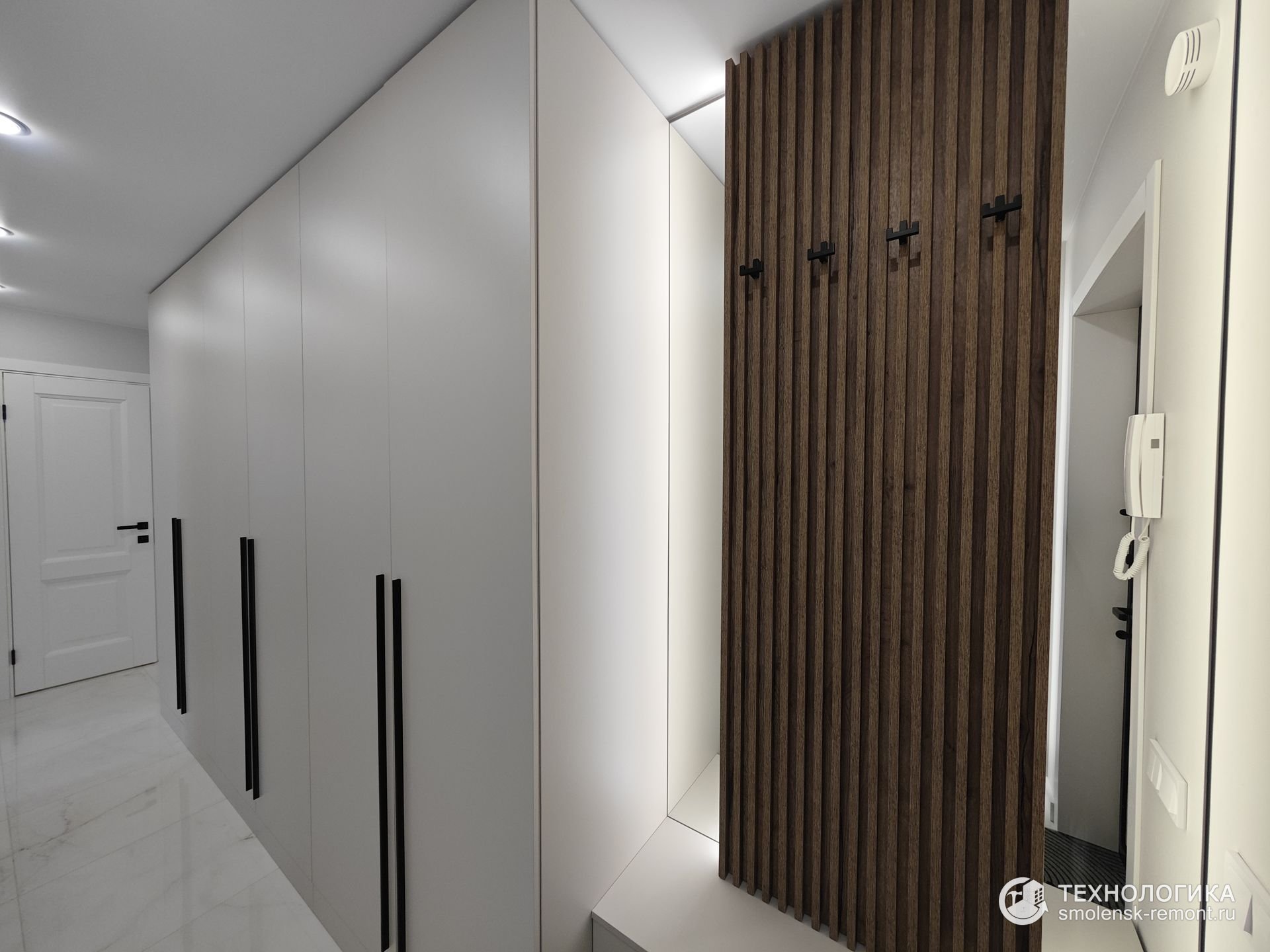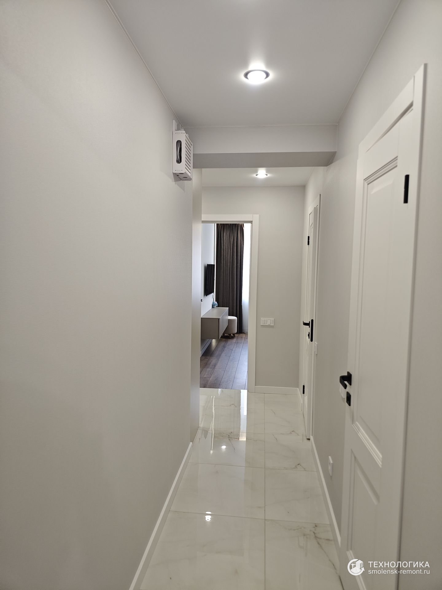 Коридор встречает светлым керамогранитом с лёгким мраморным рисунком — практичное и износостойкое покрытие, которое не боится грязи и влаги. Встроенные шкафы во всю стену скрывают систему хранения, сохраняя геометрию пространства и чистоту линий. Белые фасады с чёрными ручками подчеркивают минимализм интерьера, а точечное освещение визуально делает помещение просторнее.