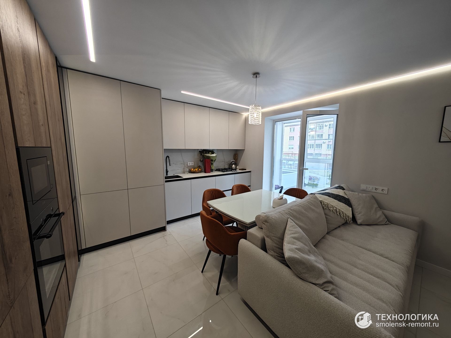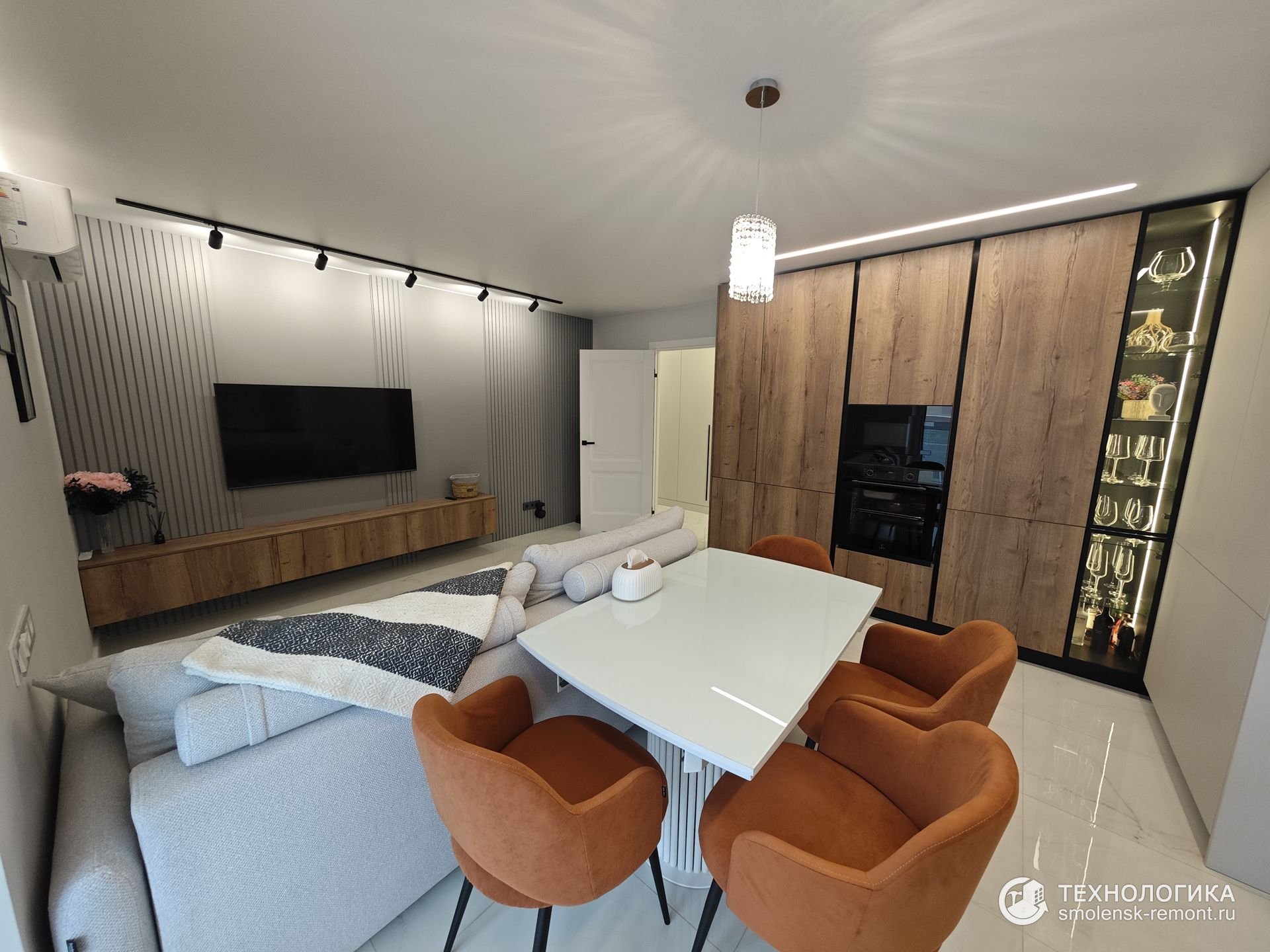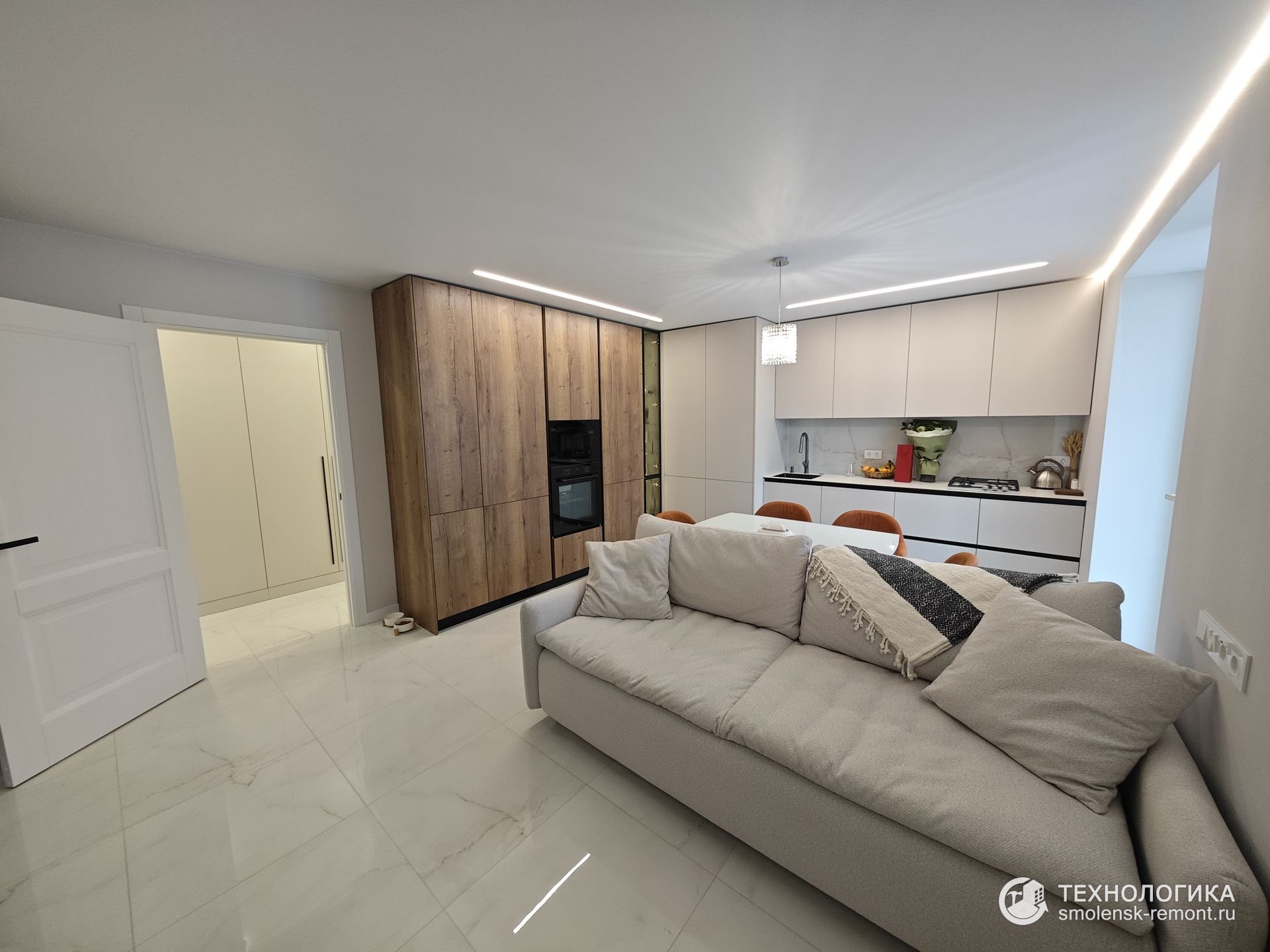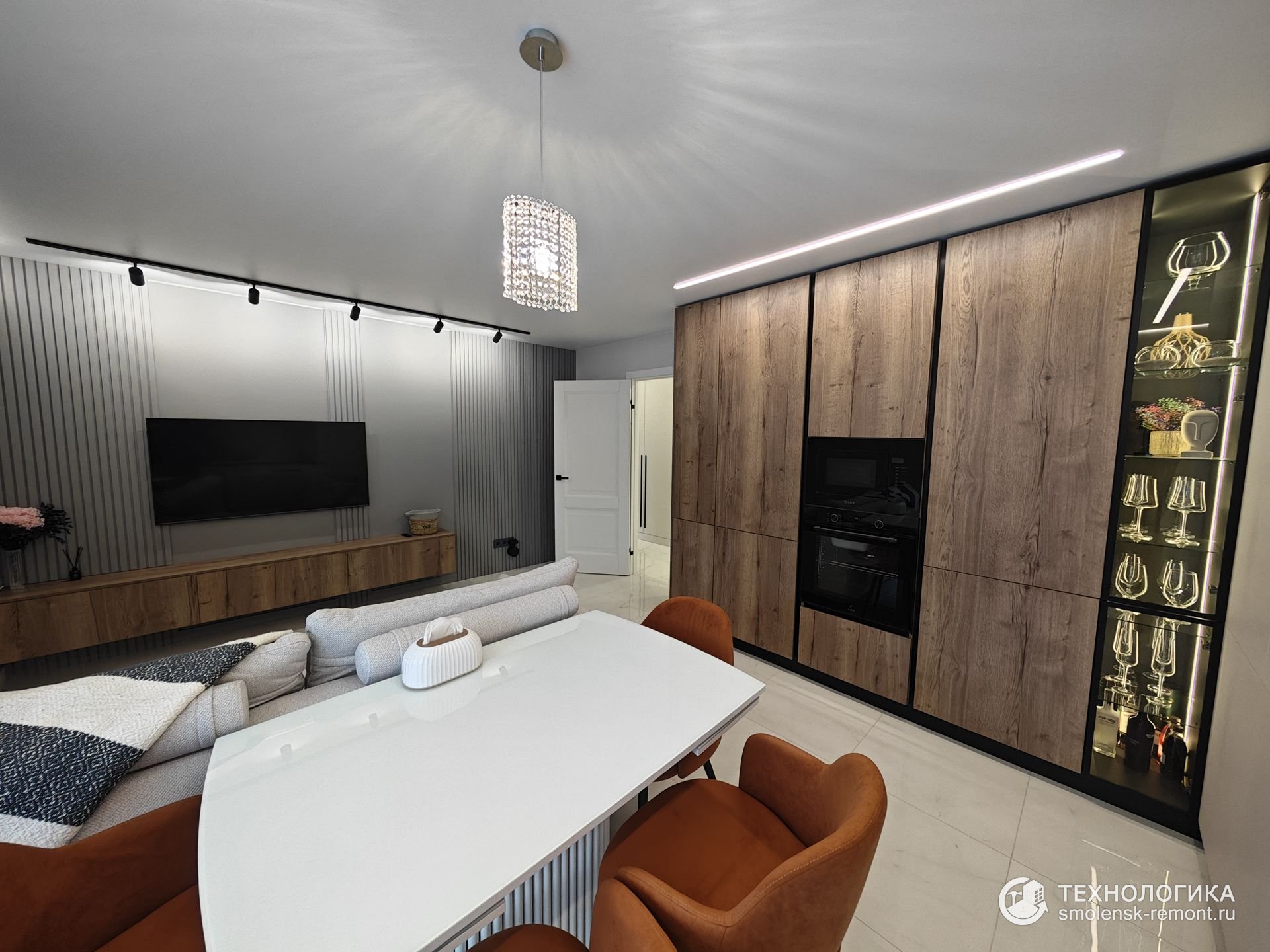 Гостиная и кухня объединены в единое пространство. Белый глянцевый пол отражает свет, усиливая ощущение объёма. Кухонный гарнитур выполнен в сочетании древесных панелей и матовых фасадов, техника встроена заподлицо. Зона хранения с подсветкой и стеклянными полками превращается в декоративный акцент — гармония уюта и лаконичности.