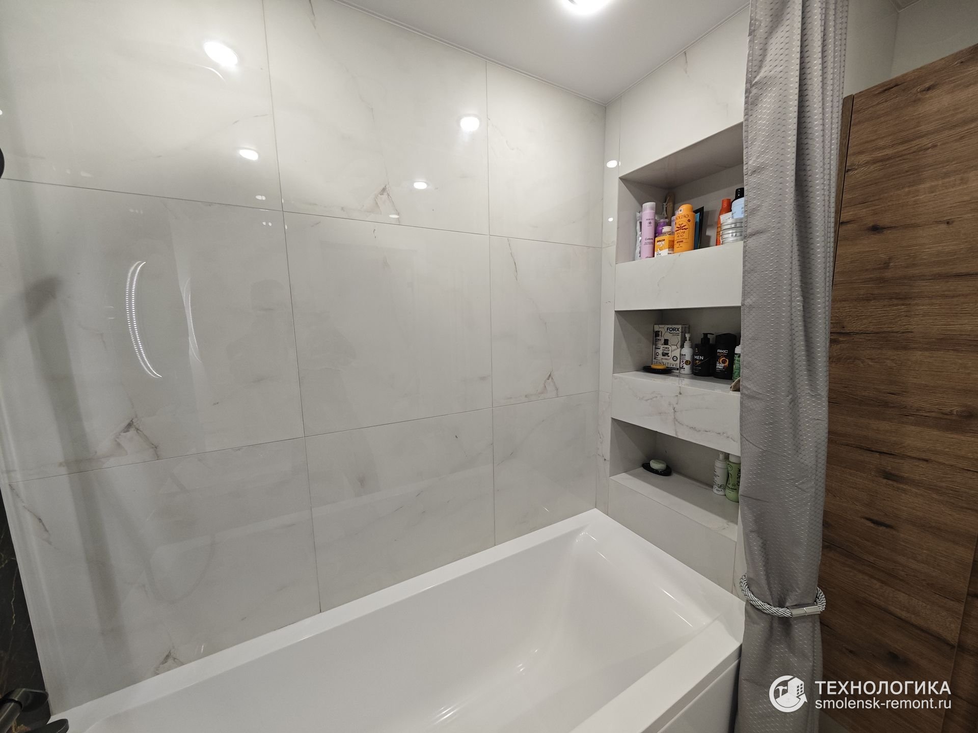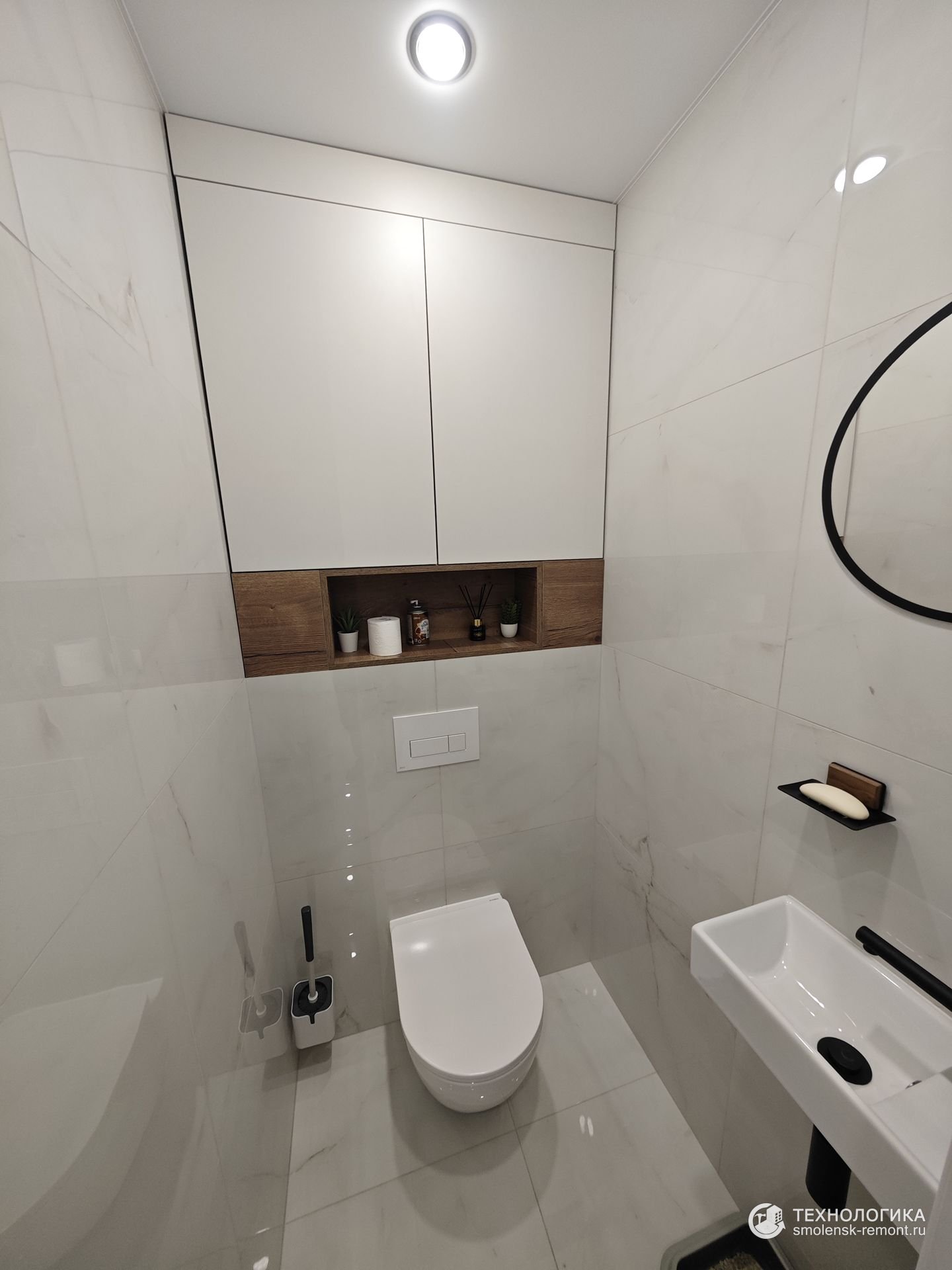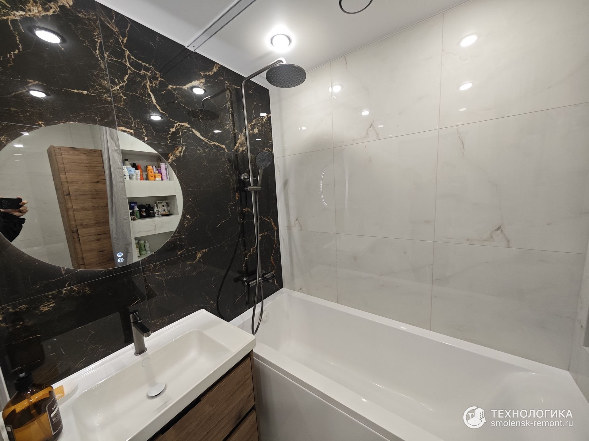 Ванная комната — контрастная и эффектная. Стены отделаны крупноформатным керамогранитом под мрамор: глубокий чёрный с золотыми прожилками и светлый бежевый создают игру света и фактур. Встроенная мебель с отделкой под дерево добавляет тепла, а круглое зеркало с подсветкой и верхний душ делают интерьер не только стильным, но и функциональным.
